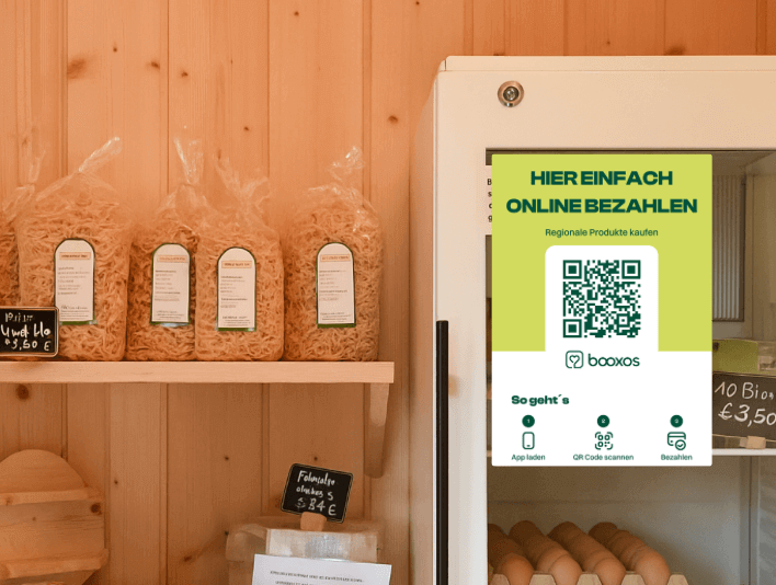 Mit booxos Go bietest du deinen Kunden modernes Bezahlen per QR-Code – sicher, unkompliziert und perfekt für deinen Selbstbedienungsstand.